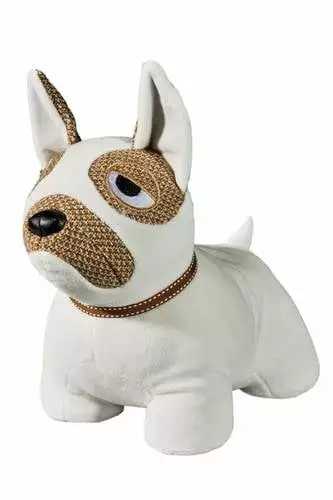 Simpatico fermaporte a forma di cane con rivestimento in morbido tessuto di lana sintetica, imbottitura in poliestere e sacchetto di sabbia, utile oggetto decorativo per la casa.