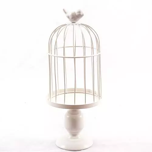 Gabbia in metallo bianco su alzata con decorazione di uccellino in ceramica.
