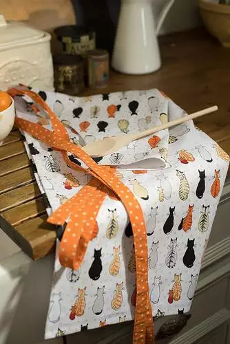 Grembiule in 100% cotone a marchio Ulster Weavers della collezione più antica e popolare, "Cats In Waiting", che continua a deliziare gli amanti dei gatti di tutto il mondo. Questo disegno illustra un'ampia selezione di gatti rivolti all'indietro con una finitura a pois arancione.