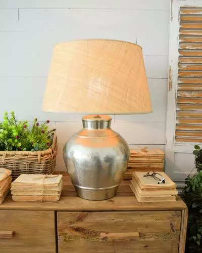 Lampada da tavolo con base in metallo martellato colore acciaio a forma di anfora, paralume diametro cm 45 in tessuto di raffia naturale con interno rigido in pvc.