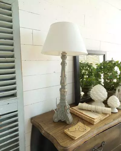 Lampada da tavolo in legno di pino colore grigio anticato.