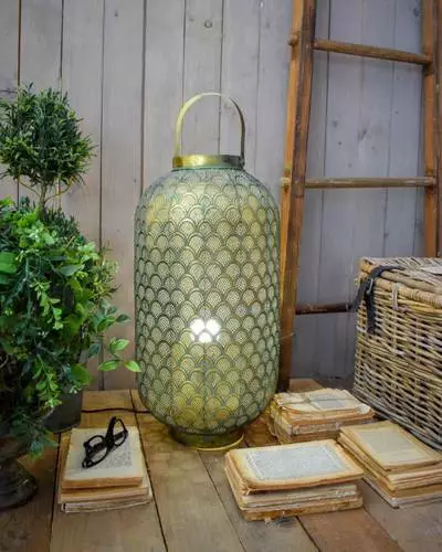 Lampada ricavata da una lanterna in metallo traforato in stile marocchino dai toni verde oro.