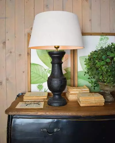 Lampada da tavolo in legno vecchio stile dal colore nero, paralume in tessuto bianco con sotegno in metallo.