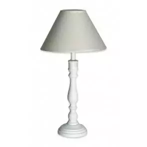 Lampada da tavolo con base lavorata in legno colore bianco.