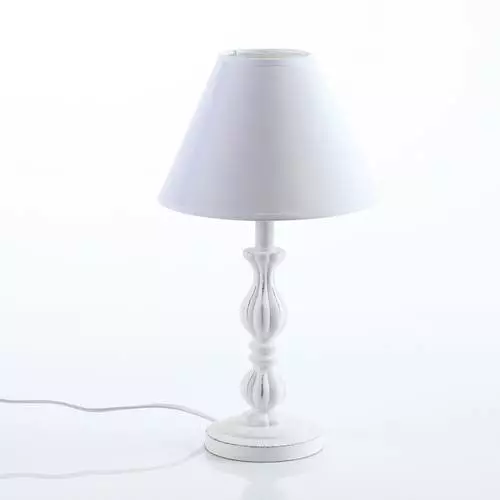 Lampada da tavolo con base lavorata in legno colore bianco dalla finitura shabby
