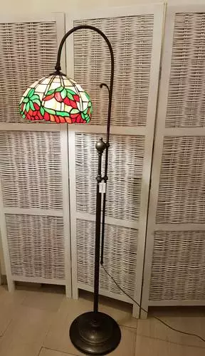 Lampada da terra con base in ottone e paralume in vetro.