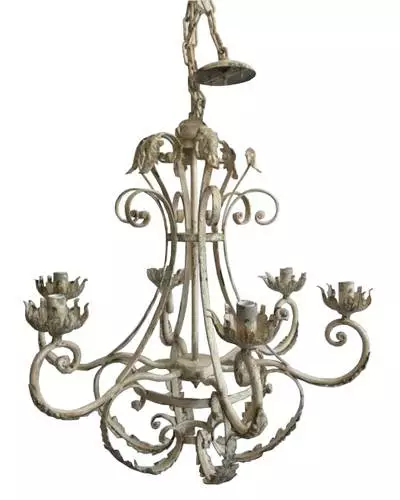 Lampadario a 6 luci dallo stile vintage retrò realizzato in ferro battuto bianco con finitura anticata.