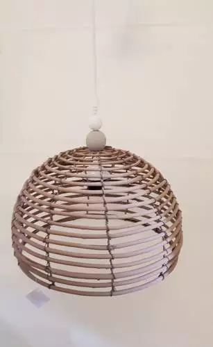 Lampadario realizzato in filo di rattan con lavorazione a spirale.