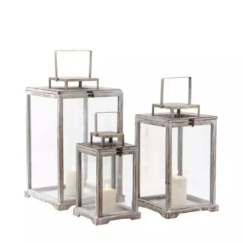 Lanterna portacandela dal formato quadrato in legno bianco anticato, dallo stile minimale con ampi vetri laterali e tetto e maniglia in metallo grigio, top con sfiato per il calore, apertura con sportello dall'alto.