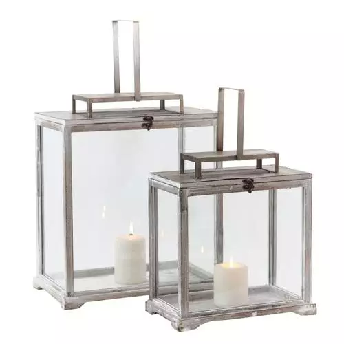 Lanterna portacandela in legno bianco anticato, dallo stile minimale con ampi vetri laterali e tetto e maniglia in metallo grigio, top con sfiato per il calore, apertura con sportello dall'alto.