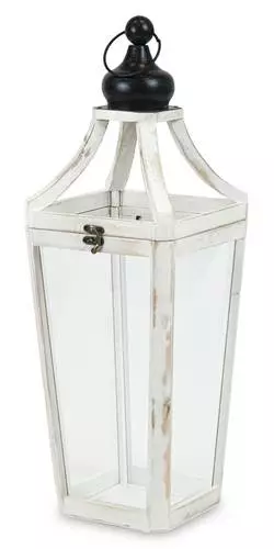 Lanterna portacandela in legno bianco e laterali in vetro con cupola di finitura in metallo nero, per illuminare terrazze e giardini, e rendere accogliente e creare un'atmosfera calda e romantica l'habitat della casa.