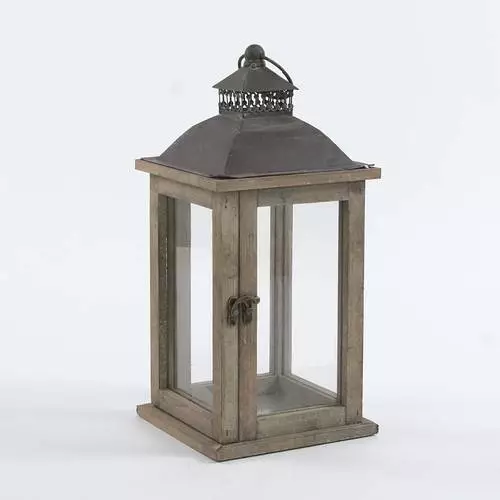 Lanterna in legno di abete colore naturale con tetto in metallo grigio e laterali in vetro.