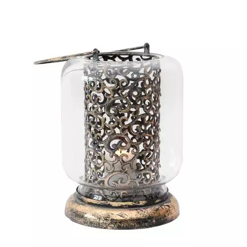 Lanterna portacandela in metallo dorato antico lavorazione traforata con cono di vetro esterno.