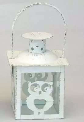 Piccola lanterna porta lumino in ferro bianco anticato in stile shabby con decorazione gufetto, laterali in vetro.