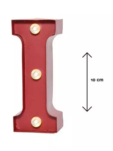 Lettera in metallo colore rosso con lampadine, da appoggio o da parete.