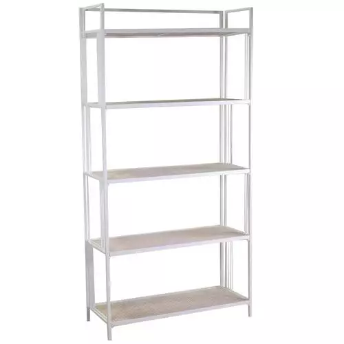 Scaffale libreria con struttura in ferro bianco e ripiani in legno sbiancati.