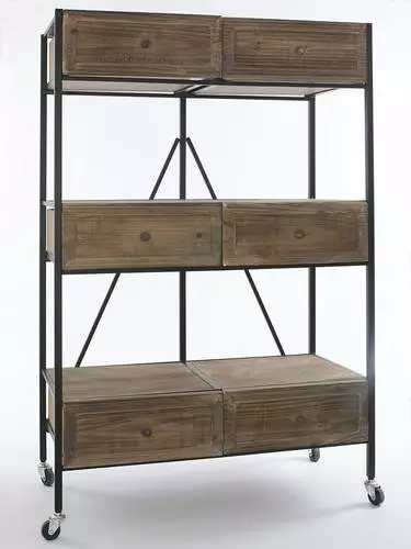 Libreria scaffale in legno di abete naturale con struttura in ferro nero, 6 cassetti, dotata di ruote.