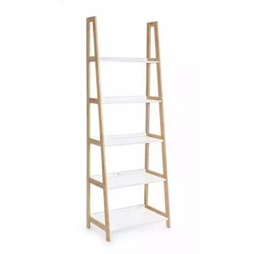 Libreria a scala con struttura in legno di bamboo naturale e piani in legno mdf laccato bianco.