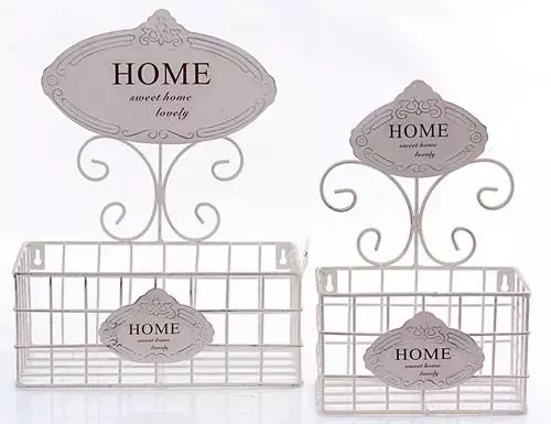 Mensola da parete in formato cestello con targhetta Home in ferro bianco lavorato in stile shabby chic.