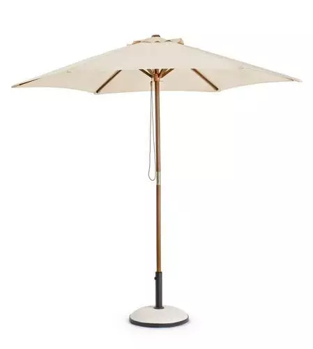 Ombrellone tondo con struttura in legno: palo mm 38 in due pezzi con connessioni in acciaio rivestito in ottone, 6 stecche 13×23 mm, telo naturale in poliestere 180gr/m2 con camino antivento.