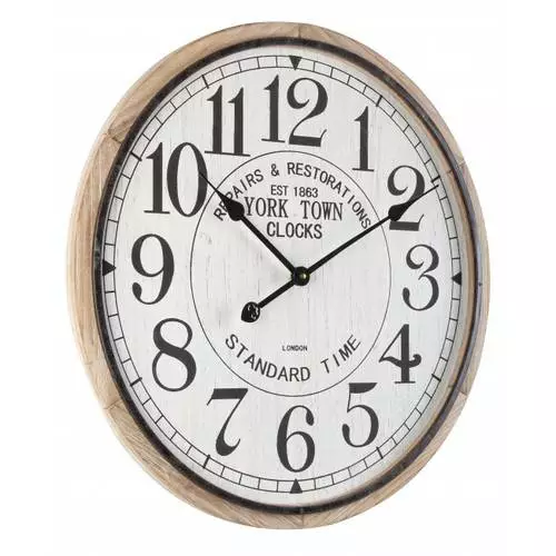 Orologio da parete realizzato in legno naturale con inserto in ferro battuto.