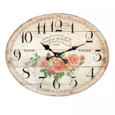 Orologio da muro di formato ovale con base in legno e applicazione di stampa in stile provenzale con fiori.