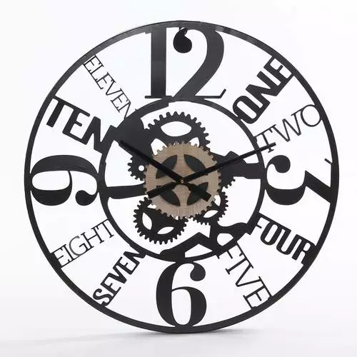 Orologio da parete realizzato in metallo nero con inserto legno.