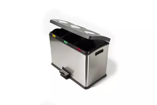 Pattumiera in acciaio inox satinato, con 3 cestelli in plastica da 12 Litri ciascuno dotati di maniglia, apertura a pedale centrale e chiusura ammortizzata soft touch.