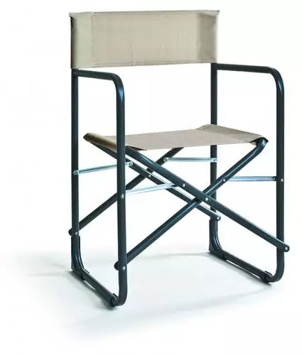 Sedia da regista pieghevole con struttura in metallo, seduta e schienale in tela poliestere idrorepellente, idonea per un utilizzo esterno da giardino e da terrazza.