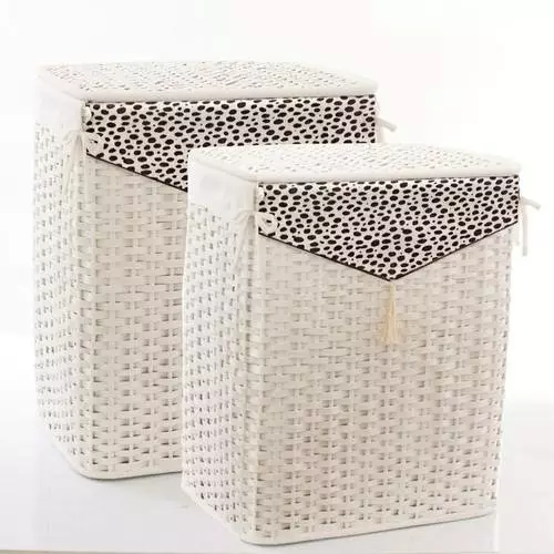 Portabiancheria in bamboo intrecciato bianco, fodera in cotone con bordo decorato.