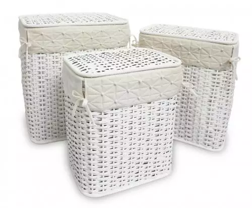 Portabiancheria in bamboo intrecciato bianco, fodera in cotone con bordo trapuntato con applicazione perle.