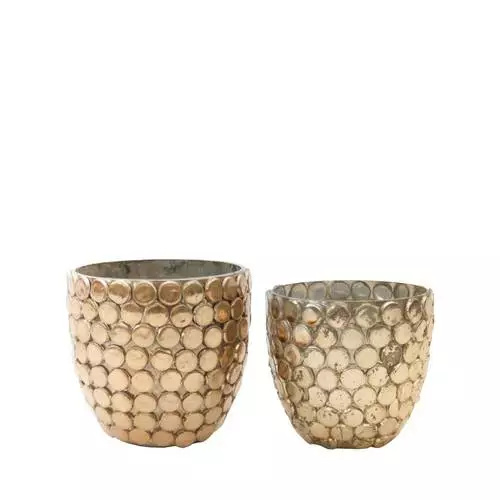 Bicchiere portacandele in vetro con finitura dorata e lavorazione a gocce in rilievo, disponibile in due misure.