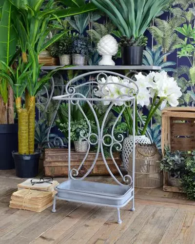 Porta ombrelli rettangolare salvaspazio da parete in ferro battuto grigio in stile shabby chic, raffinato ed elegante, con pratica vaschetta per raccogliere l'acqua.
