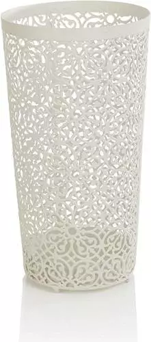 Portaombrelli tondo in metallo bianco con motivi floreali traforati, dallo stile shabby, raffinato ed elegante, anche molto pratico.