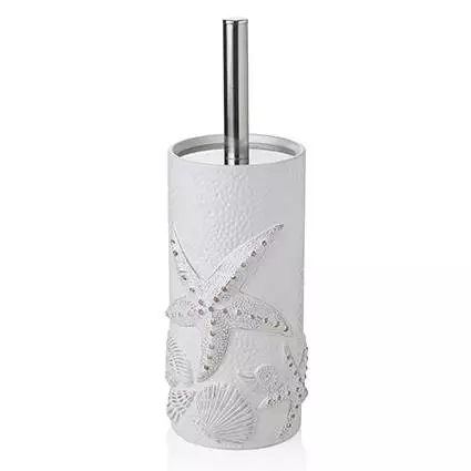 Portascopino da bagno con tazza in ceramica bianca decorata, manico metallo cromato e spazzolino in nylon.