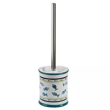 Portascopino da bagno con tazza in ceramica bianca decorata con pesci blu, manico metallo cromato e spazzolino in nylon.