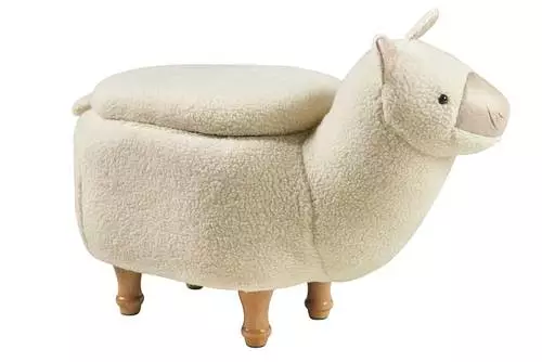 Pouf contenitore a forma di alpaca realizzato in morbido tessuto, piedini in legno, comoda seduta seduta imbottita, perfetto poggiapiedi da posizionare davanti al divano, originale articolo d'arredo per ogni ambiente delle casa.