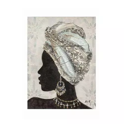 Quadro dipinto a olio su tela con applicazioni a rilievi del copricapo della figura di donna.