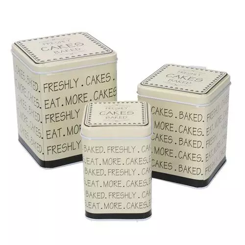 Scatola in latta da cucina smaltata in colore avorio, per dolci, biscotti, the, zucchero o caffè, con esterno decorato con simpatiche scritte.