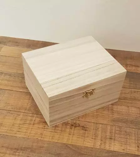 Scatola in legno grezzo di balsa con chiusura in metallo.