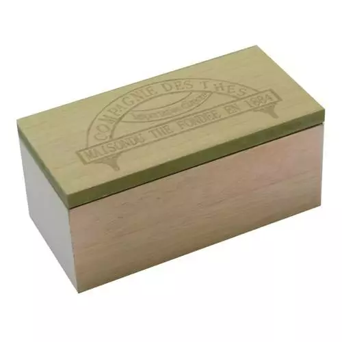 Scatola 2 scomparti porta bustine tea/tisane in legno colore naturale con coperchio verde.