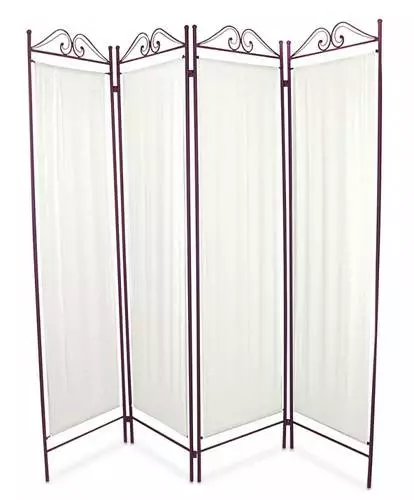 Separé 4 ante con struttura in ferro battuto colore marrone e tela in cotone bianca.