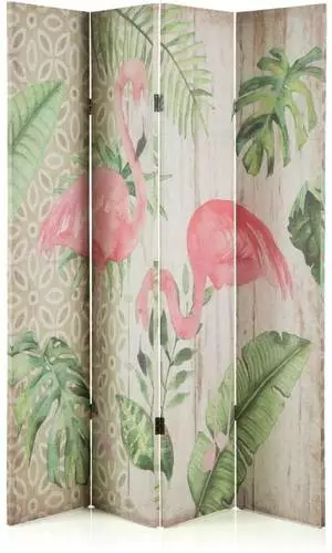 Separè a 4 ante in tela di lino stampata con struttura in legno di abete, con diversa stampa dai due lati.
