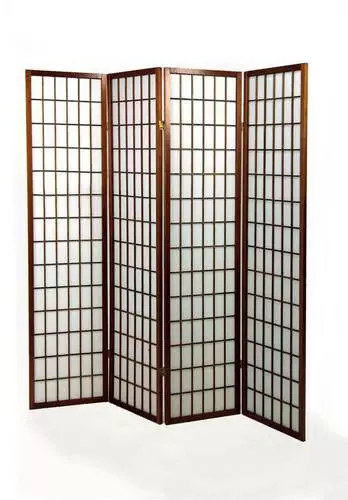 Separè modello giapponese con struttura in legno di abete colore noce a griglia e pannello bianco in carta di riso.