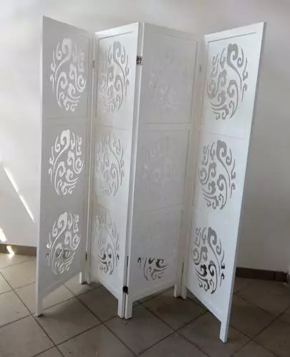 Separè 4 ante con struttura e pannelli intagliati con traforo di fiori in legno laccato bianco opaco.