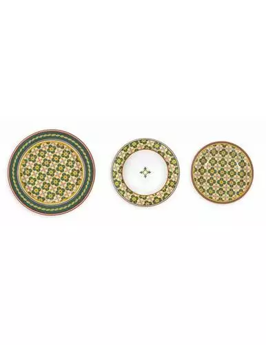 Servizio composto da 18 pezzi: 6 piani. 6 fondi e 6 dessert.