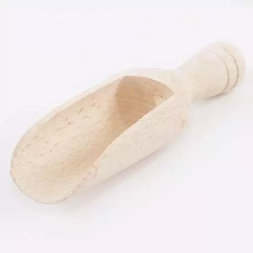 Sessola in legno naturale grezzo non trattato, adatto al contatto con alimenti, come farina, cereali, zucchero e sale.