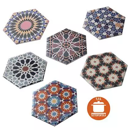 Sottopentola in ceramica di forma esagonale effetto mattonella, fondo antiscivolo, disegni e colori assortiti.