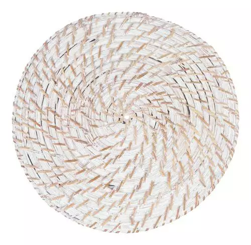 Sottopiatto intrecciato in rattan con finitura sbiancata.