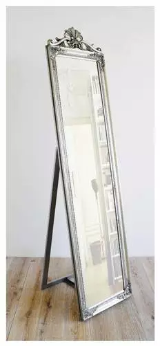 Specchio da terra con supporto con cornice in legno di paulownia dipinta in argento anticato, decorazione superiore di finitura con cimasa.